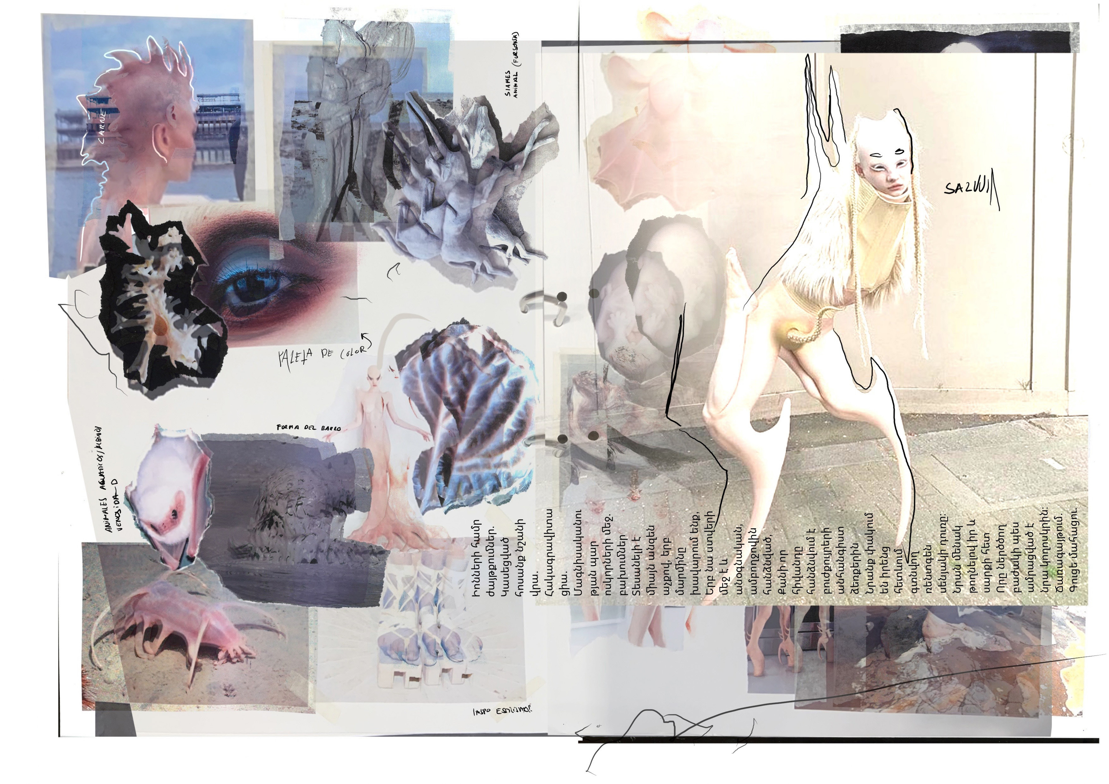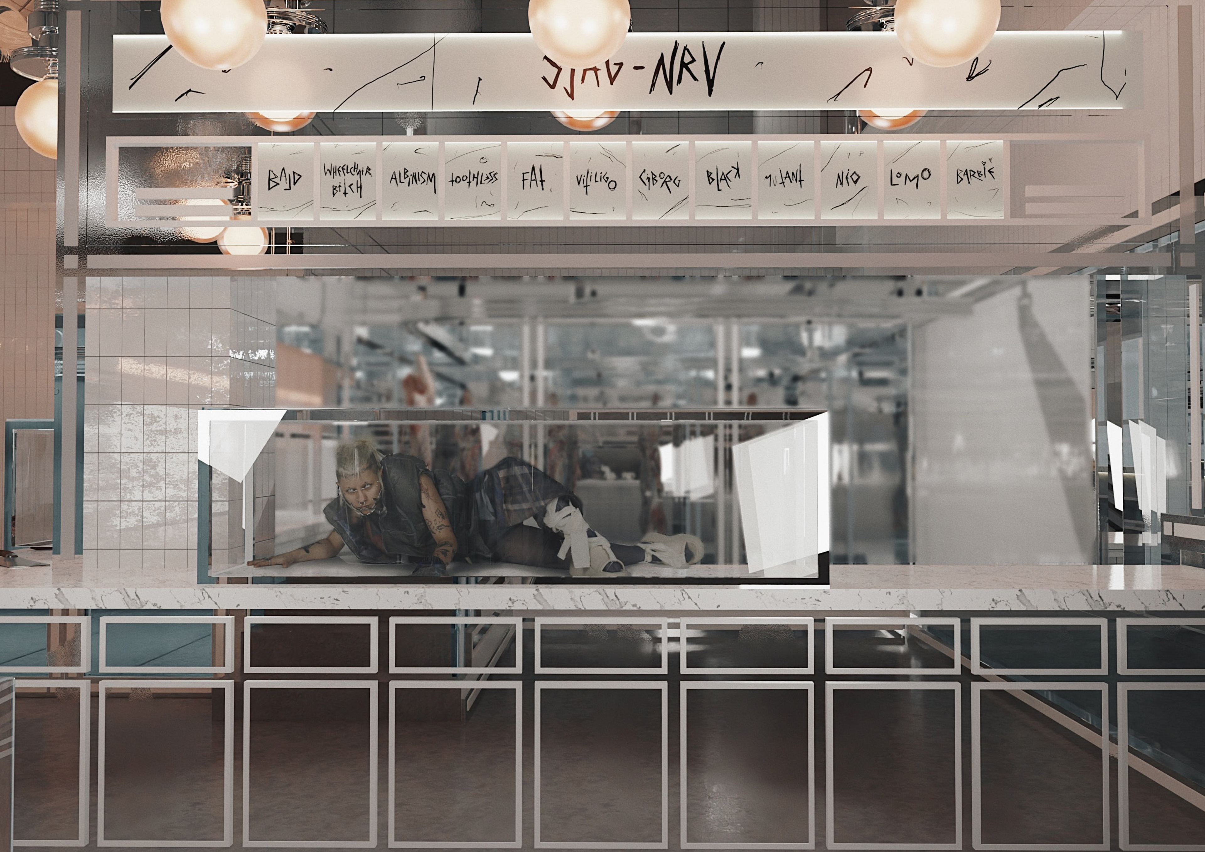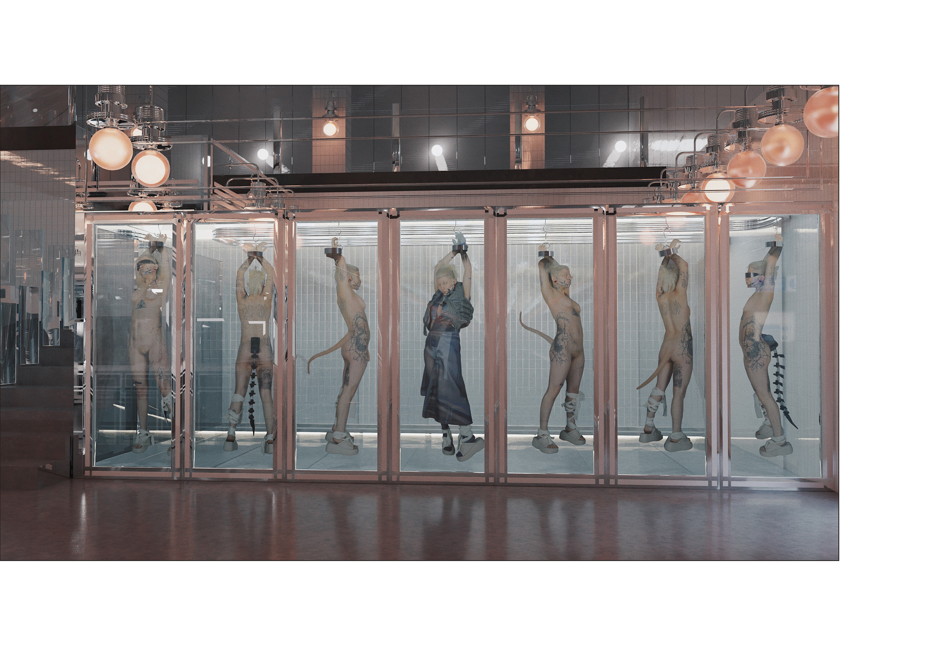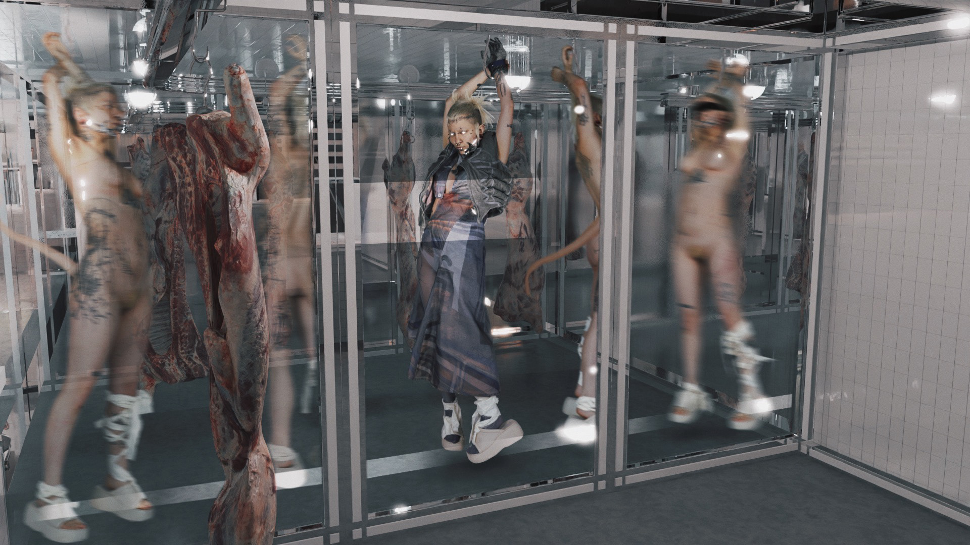 Esta colección trata sobre cómo vuelvo a renacer habiendo muerto psicológicamente, pues he mutado, y sigo en la carnicería de mutantes en la que me encontraba antes de morir expuesto desde una vitrina a clientes que quieren comprarme y comerme.