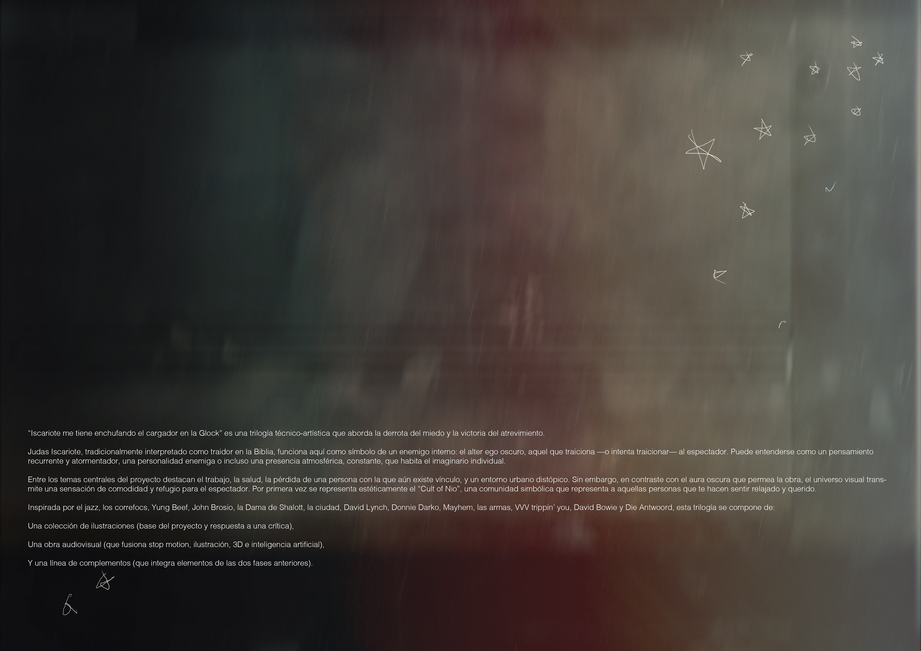 “Iscariote me tiene enchufando el cargador en la Glock” es la primera parte de una trilogía técnico-artística que aborda la derrota del miedo y la victoria del atrevimiento.